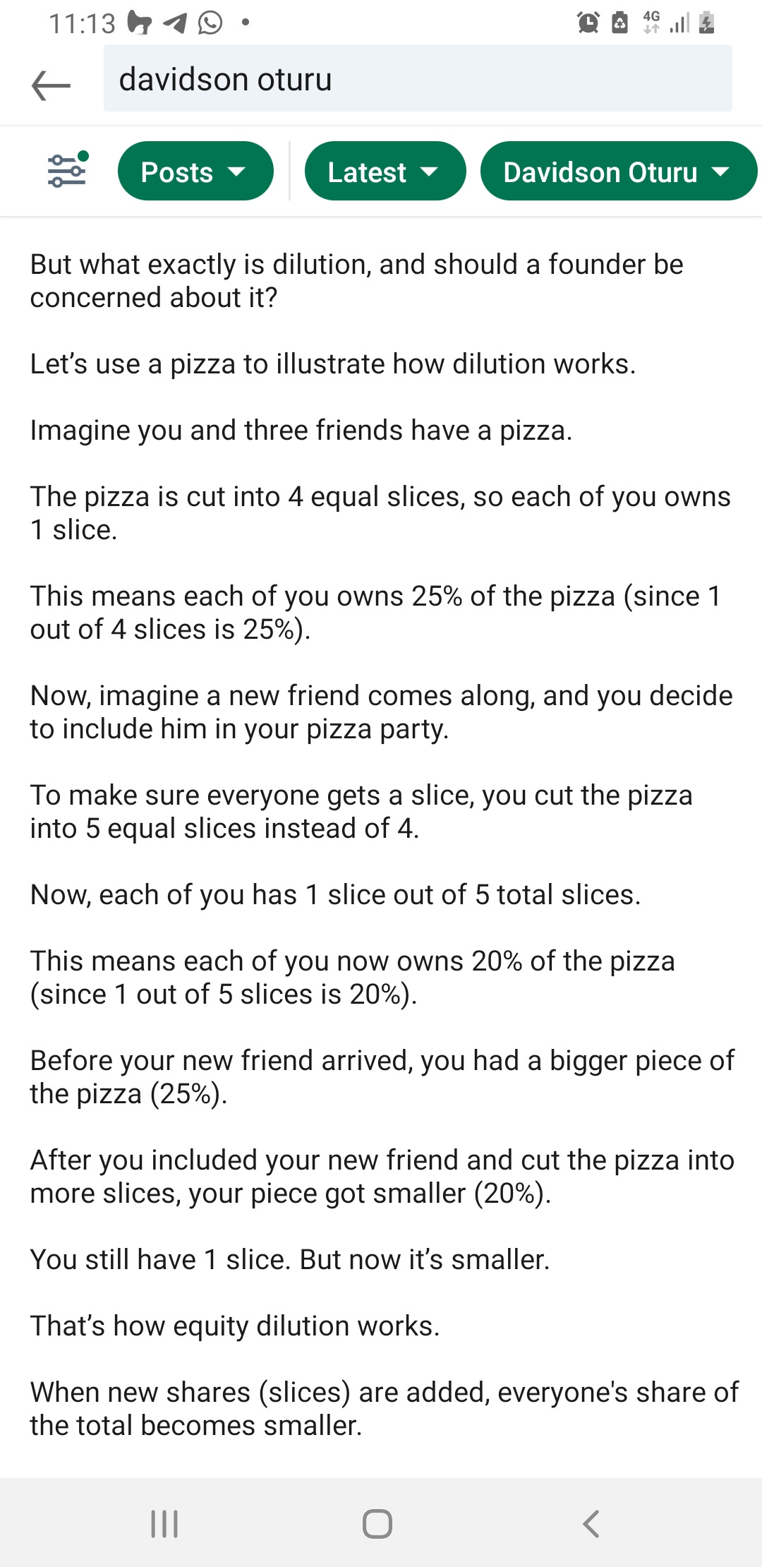I recently saw a LinkedIn post by Davidson Oturu explaining Startup dilution using a Pizza analogy. I decided to take it a step further. I explained how less is more. See the screenshot below.